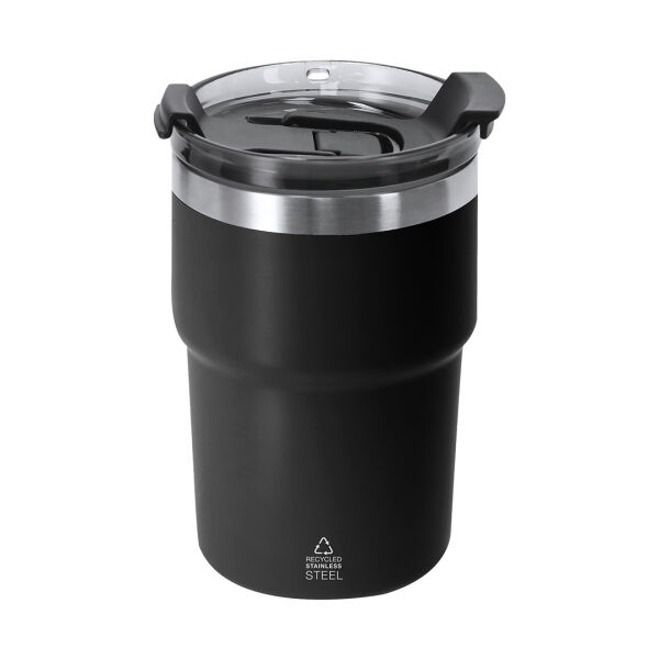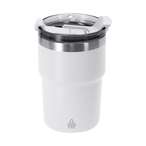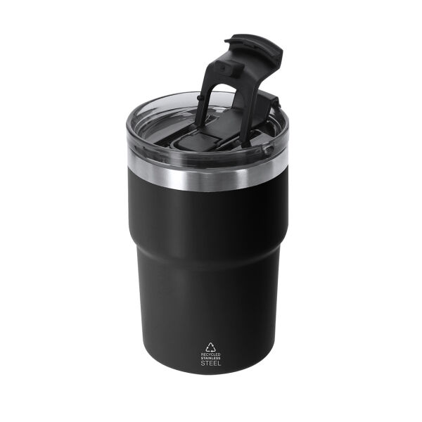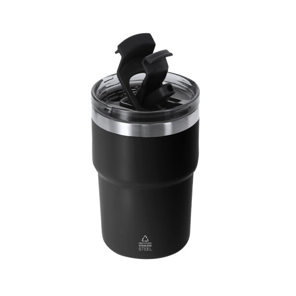 Thermisch vat met dubbele wand van 350 ml capaciteit. Gemaakt van gerecycled roestvrij staal in een semi-matte afwerking. Het heeft een dubbel drinksysteem, aangepast aan de gebruiksvoorkeuren. Met een hermetisch afsluitingssysteemdeksel. BPA-vrij. Met een gerecycled roestvrijstalen badge.