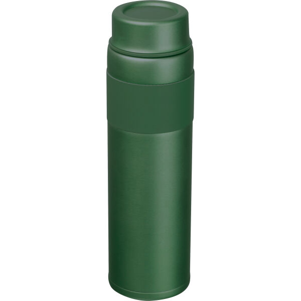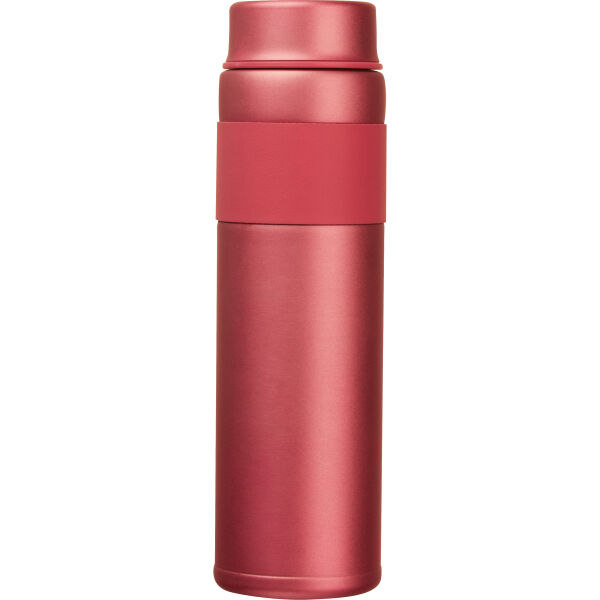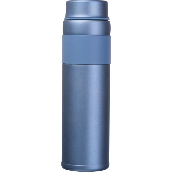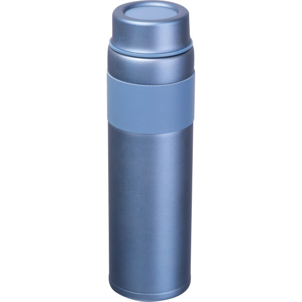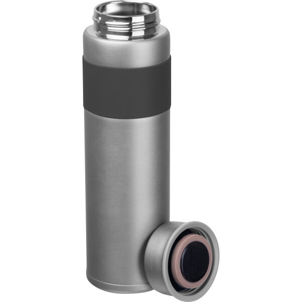 Dubbelwandige, vacuümgeïsoleerde roestvrijstalen waterfles met een inhoud van 600 ml. De bijpassende PU-band zorgt voor een comfortabele grip. Uw logo wordt op de fles gegraveerd.