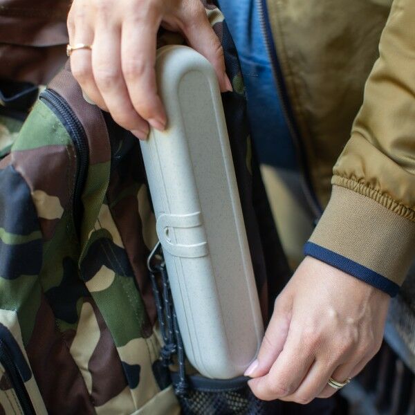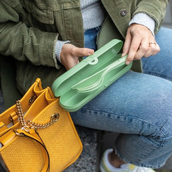 Het dreamteam voor onderweg. De KLIKK bestekset wordt geleverd in een stijlvolle box, waarmee het mes, de vork en de lepel veilig en schoon kunnen worden vervoerd van A naar B. Zelfs na de maaltijd kunnen alle bestekdelen hier hygiënisch worden opgeborgen. De slanke box heeft een praktische clipsluiting en vindt ruimte in elke zak of handtas.
