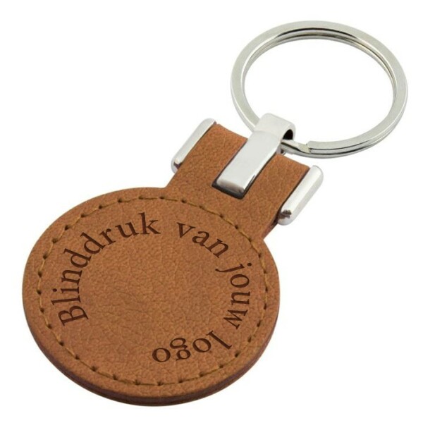 Kunstlederen sleutelhanger met stevige metalen ring en bevestiging. Inclusief blindruk logo en/of tekst aan beide zijden