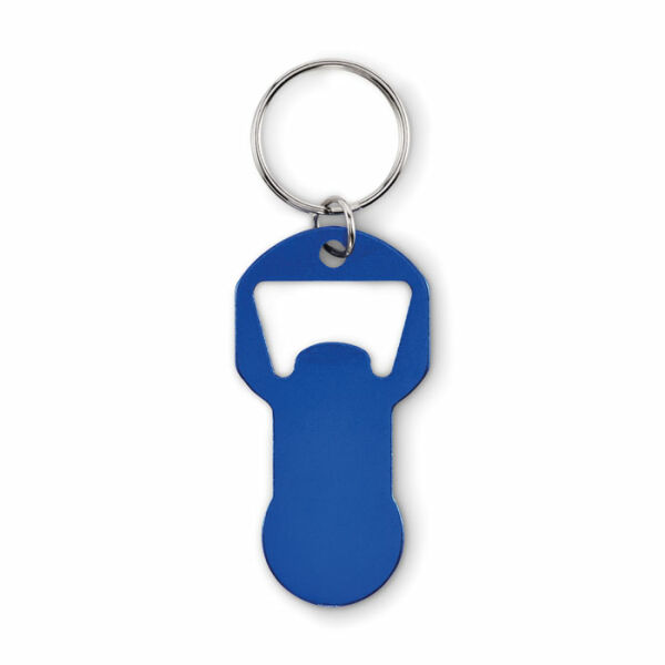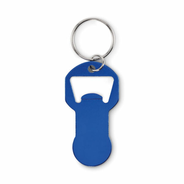 Sleutelhanger met token (geschikt als winkelwagenmunt) en flesopener van gerecycled aluminium met ijzeren ring.