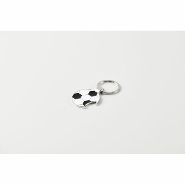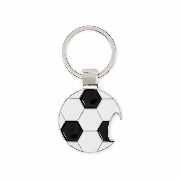 Sleutelhanger in voetbalvorm met flesopener, gemaakt van zinklegering en voorzien van ijzeren ring.