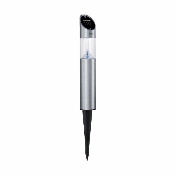Solar LED lamp van het merk Grundig. Gemaakt van een combinatie van RVS en kunststof. Zodra het donker wordt, schakelt het witte licht (2 LED) automatisch in. De ideale verlichting op zonne-energie voor tuin of oprit. Voorzien van een grondpin en gemakkelijk te verplaatsen. Na volledig opladen geeft de lamp 6 tot 8 uur licht. Spatwaterdicht. De RVS behuizing is weerbestendig. Inclusief oplaadbare AAA Ni-Mh 1.2V batterij (600 mAh). Per stuk verpakt.