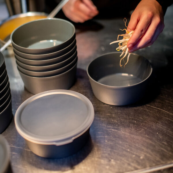 The universal takeaway bowl for ramen, pasta, soups, salads, and more. MOVE BOWL has just the right format for the trendiest foods and its sustainable design makes it simply indispensable in modern gastronomy. The bowls are specially designed to meet the requirements of contemporary catering, both for takeaway and on-site consumption. In the leak-proof bowl, dishes remain fresh and crisp for a long time and can be transported without a problem. The bowls are neatly stackable, and each bowl can be easily removed from the stack.