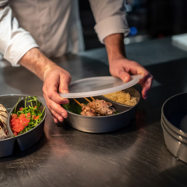 MOVE LID seals the MOVE menu plate airtight, making it leak-proof. When turned upside down, it functions as a perfect cover for the microwave. The raised rim reliably prevents the trays from slipping during transport, while at the same time it is so cleverly designed that dishwater can drain off easily. There is an integrated tab for a tag with information about the contents.