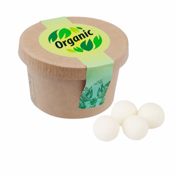 Bekertje van ongebleekt karton, gevuld met ca. 130 gram Compli'mints en voorzien van een full colour sticker met sluitzegel op de deksel