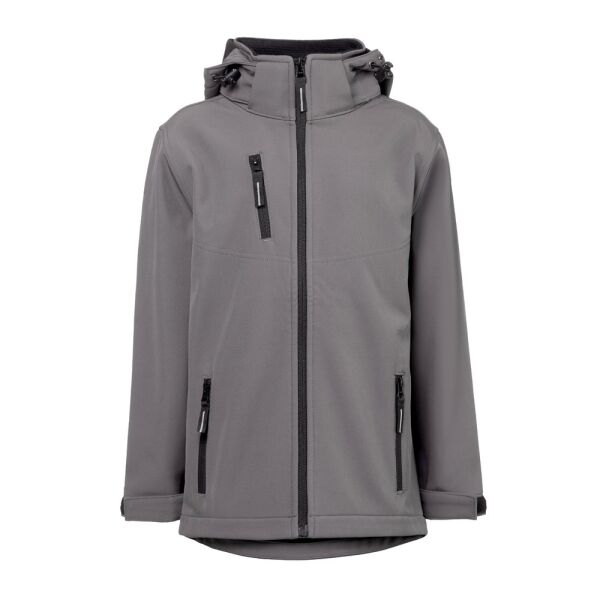 Kinderjas van 96% gerecycled polyester softshell en 4% elastaan (280 g/m²), met twee veters en waterafstotende voering. Met fleece gevoerde jas (100% gerecycled polyester) met 2 voorzakken en een diagonale borstzak, beide met rits. Afneembare en verstelbare capuchon met trekkoord en zelfklevende ritsband om de kraag aan te passen. Opening aan de voorkant met YKK® rits - een merk dat gebruik maakt van moderne apparatuur en hoge kwaliteitscontrole. Verstelbare manchetten met zelfklevende sluitband. Afgeronde onderrug