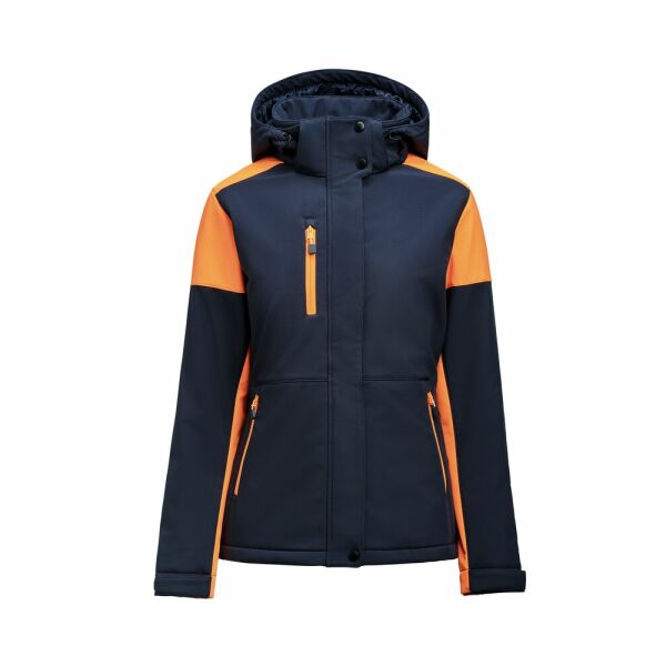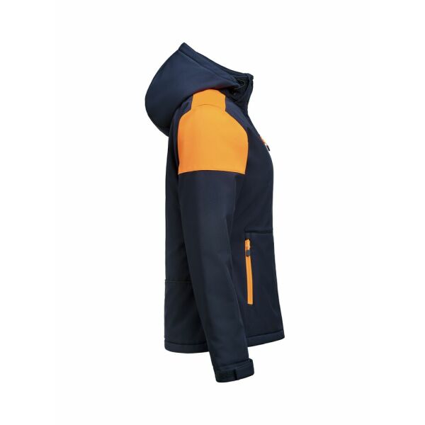 Gevoerde bicolor softshell jas met afneembare capuchon, contrasterende ritssluitingen en stormflap met drukknopen. Aanpasbare mouwen met velcrosluiting en trekkoorden aan de capuchon en de zoom. 2 binnenzakken met ritssluitingen. Reflecterende piping op de rug. Uitscheurbaar neklabel en afzonderlijk geweven maatlabel. Aan de binnenzijde van de linkerzijnaad werd een zakje voorzien voor het innaaien van een waschip. Zippullers in contrasterende kleur. Oeko-Tex 100 gecertificeerd.