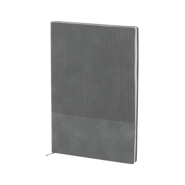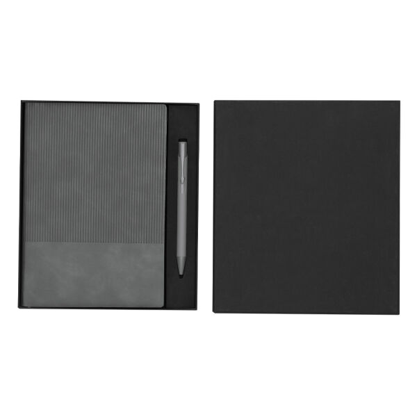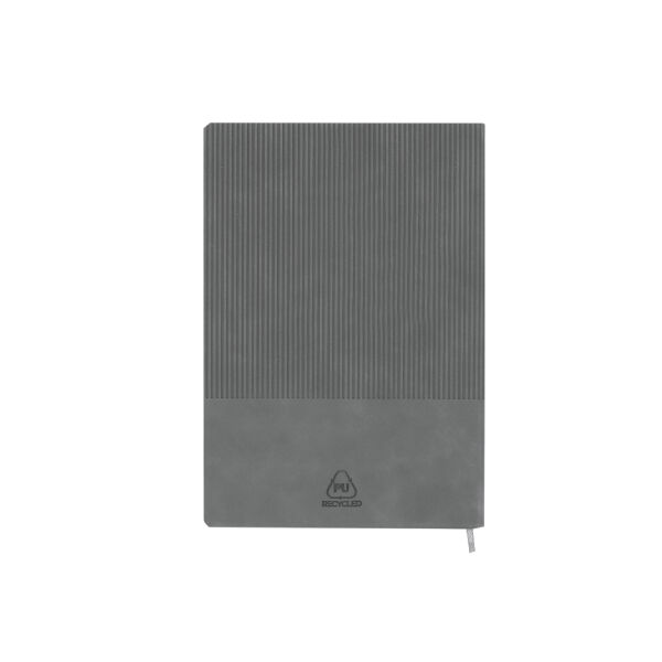 Set notitieblok en pen gemaakt van gerecycled PU en gerecycled aluminium. De set bevat: - Notitieblok gemaakt van gerecyclede PU, met flexibele hoezen. Bevat 96 crèmekleurige pagina's met lijnen, een bijpassende bladwijzer. Met PU Recycled Badge. - Gerecycled aluminium pen, met een rubberen afwerking. Hij heeft een clip, drukknopmechanisme en blauwe inkt. Inclusief gerecycled aluminium badge.