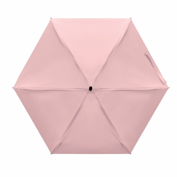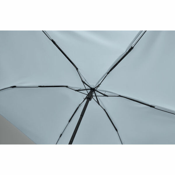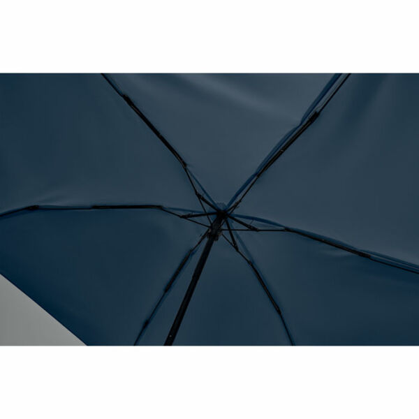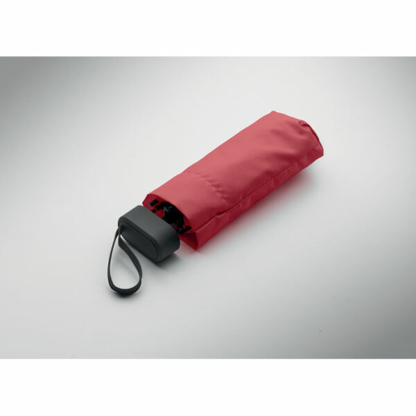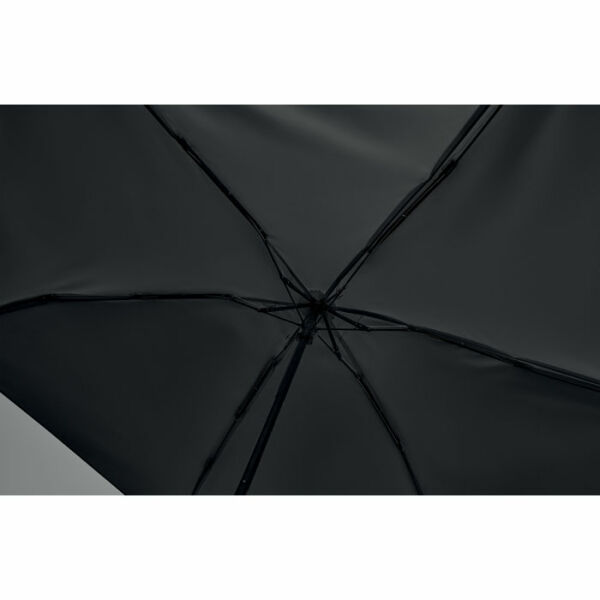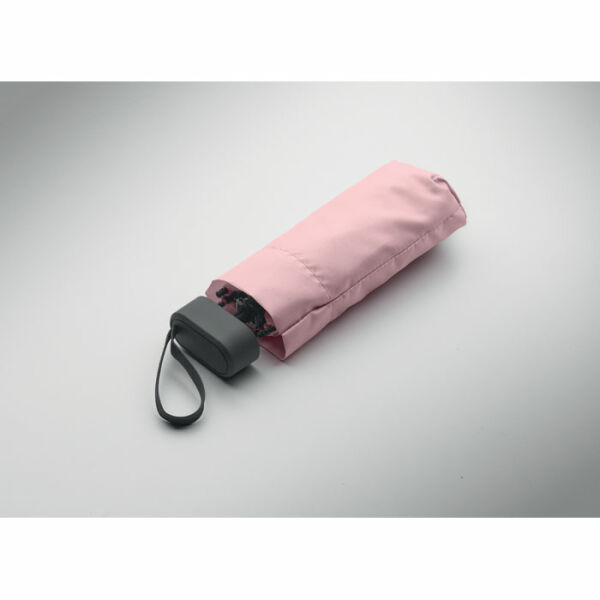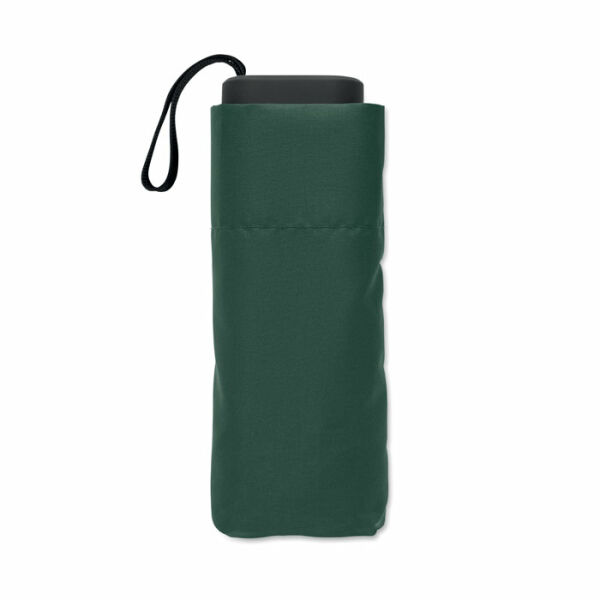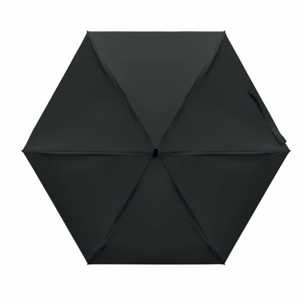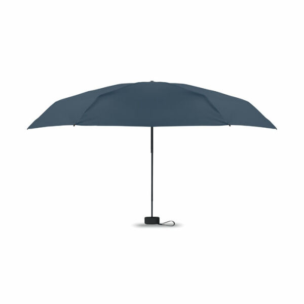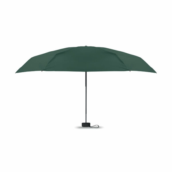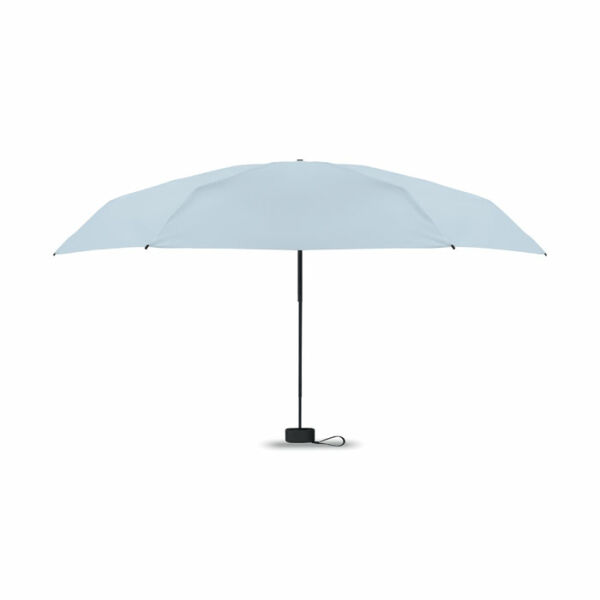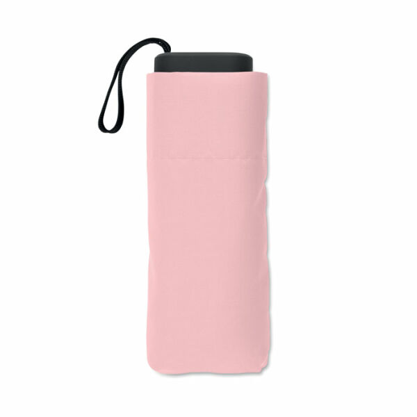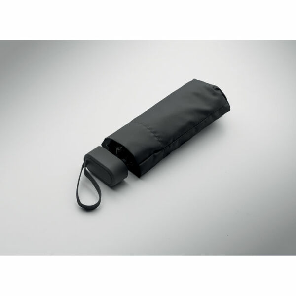 19 inch 5-voudige handmatige paraplu van 190T pongee met bijpassende pouch. Windbestendig frame van metaal en glasvezel, zwart rubberen handvat met polsband en een compact opgevouwen formaat tot 17cm.